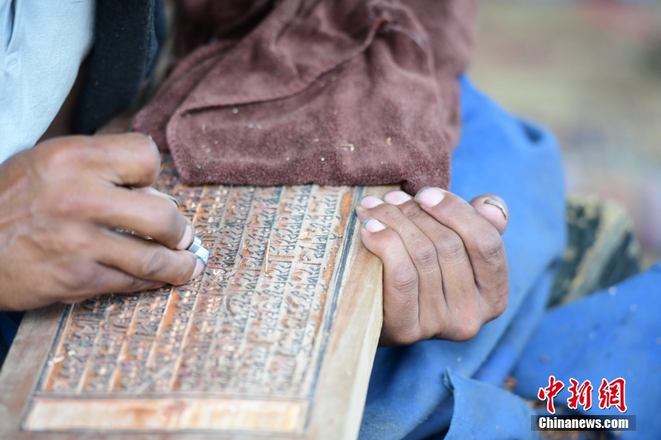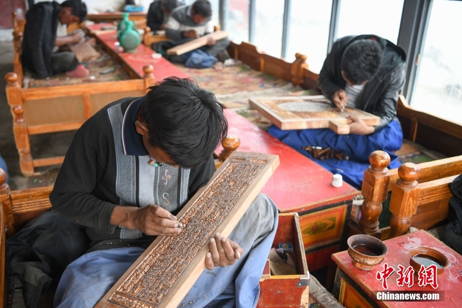 Photo shows that artists in the Treasure Carving Handicraft Farmers and Herdsmen Professional Cooperative in Nyimu County are carving scripture board.