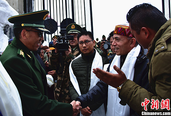 Bude, assistant chief of staff for the Tibet Public Security Border Defense Corps (left), shakes hands with Indian official attending the ceremony to open the Sino-Indian border at Nathula for trade in 2018.[Photo/China News Service]