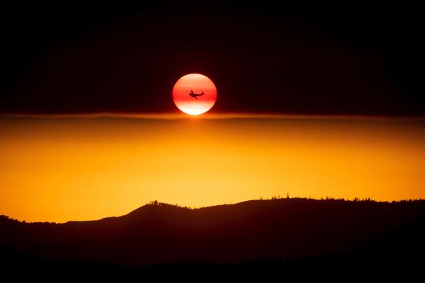 A plane battling the Ferguson Fire passes the setting sun in unincorporated Mariposa County Calif., near Yosemite National Park on Sunday, July 15, 2018. [Photo: AP/Noah Berger]