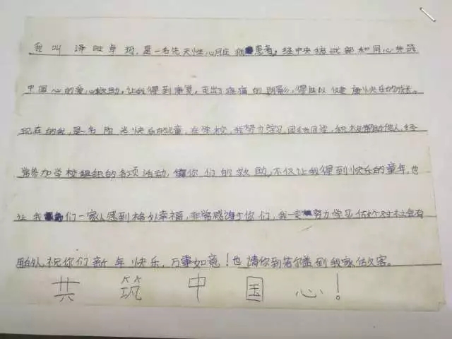 “Now I am a sunny, happy child. At school, I study hard, get along well with my classmates, help others , and actively take part in all kinds of activities organized by the school. Your aid has not only given me a happy childhood, it is also a special blessing to our family. Thank you very much. I will study hard and give back to the society. I wish you all goes well and please come to stay with us at Ruoergai.”