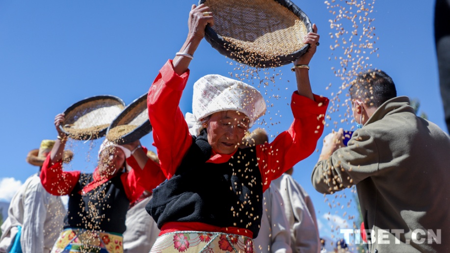 On September 23, 2025, villagers in Dianchong Village, Qangga Town, Lhunzhub County, Lhasa, the Xizang Autonomous Region, carried out traditional highland barley threshing.