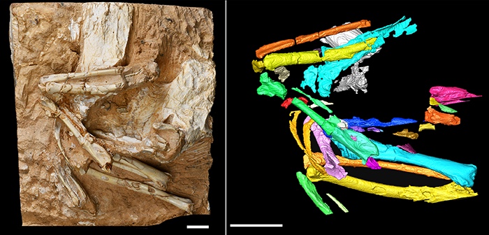 The fossil of the partial skeleton includes the shoulder girdles, wishbone, bones from both wings, vertebrae, and part of a leg. Unfortunately, the skull is missing, researchers said.