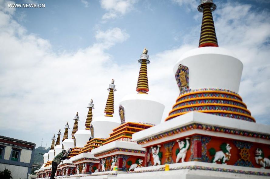 A staff member paints the pagoda at the Taer Monastery in Huangzhong county, Northwest China's Qinghai province, June 27, 2015. [Photo/Xinhua]
