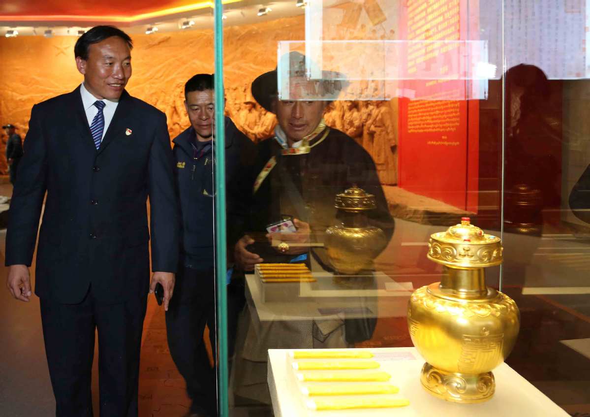 Karma Tsegyal (left), a village official from Tibet's Dengchen county, visits the Tibet Serfs Emancipation Memorial Hall with friends on Thursday. The hall opened to mark the 60th anniversary of Tibet's democratic reforms. [Photo/China Daily]