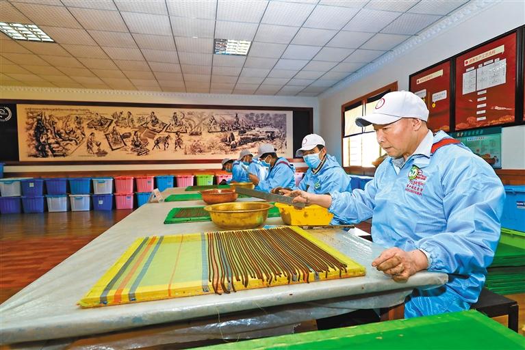 The picture shows the employees of Youminba Tibetan incense processing enterprise, a well-known Tibetan incense brand in the Tibet Autonomous Region, producing Tibetan incense.