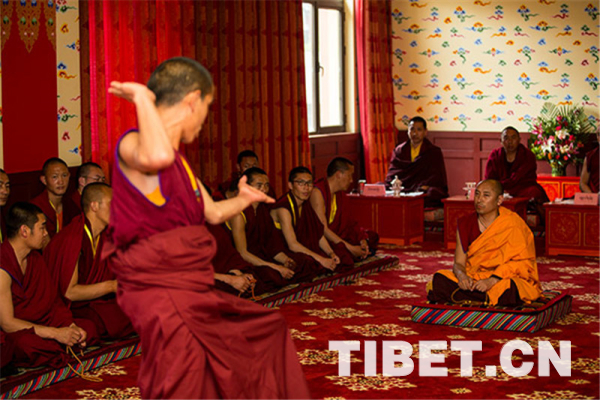 Photo shows monks from Sakya sect of Tibetan Buddhism are attending the scripture debate exam.