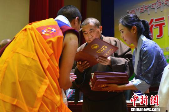 Drukhang Tupdeng Keldrol (center), dean of the Tibet Buddhist College, awards graduate certificates to a student. [Photo/China News Service]