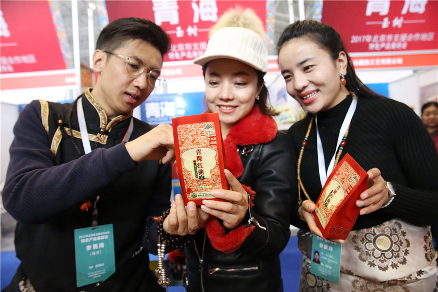 Retailers introduce Tibet's highland barley tea at an exposition in Beijing. [Photo/China Daily]