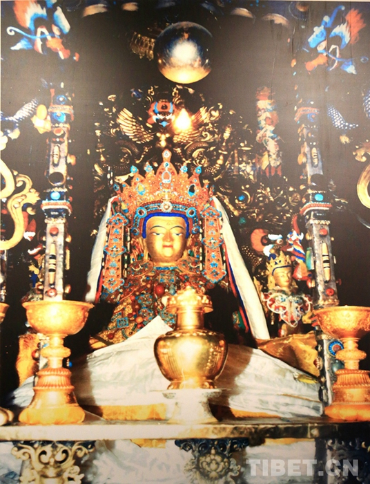 The golden urn with three children’s names in front of the Sakyamuni Buddha statue in Jokhang Temple, Lhasa, capital of Tibet Autonomous Region.