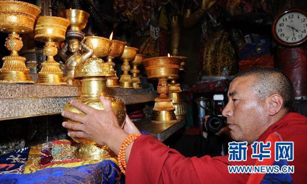 A replica of the golden urn and ivory slips bestowed by the Qianlong Emperor of the Qing Dynasty to the Eighth Dalai Lama is on display at a museum in Lhasa, Tibet Autonomous Region, August 11, 2014. Photo: cnsphoto