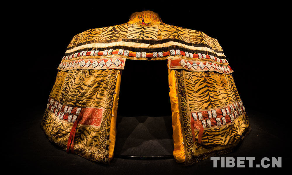 In 1638, the Mongolian leader Gushri Khan met with the fifth Dalai Lama. This tiger skin tent was gifted to the fifth Dalai Lama by Gushri Khan around this time. “The tiger skin tent uses more than 100 tiger skins. The two black circles on the top are made of black bear skin, and the white part mixed with the black bear skin is camel skin. Leopard skin is used on both sides of the tent frame, along with more than 10,000 seashells set in auspicious patterns around the edges. Such a tent would have been very expensive. Considering that seashells were a kind of currency that could have been circulated in the local area, the whole tent was worth the equivalent of 200 million yuan.”