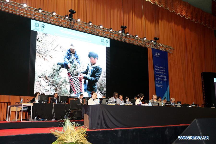 The introduction video of China's Lum medicinal bathing of Sowa Rigpa is being shown to delegates at the 13th session of the UNESCO Intergovernmental Committee for the Safeguarding of the Intangible Cultural Heritage in Port Louis, Mauritius, Nov. 28, 2018. The United Nations Educational, Scientific and Cultural Organization (UNESCO) inscribed on Wednesday China's Lum medicinal bathing of Sowa Rigpa on the Representative List of the Intangible Cultural Heritage of Humanity. [Photo/Xinhua]