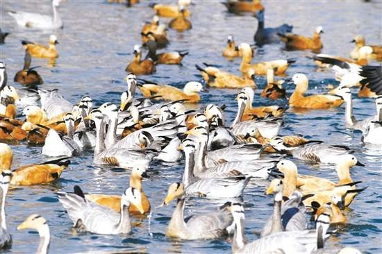 During December in Lhasa, groups of bar-headed geese, ruddy shelducks, yellow ducks, and black-necked cranes could be seen grazing or flying along the Lhasa River Valley.