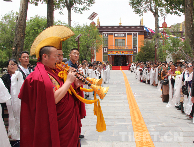 Monks greet the 11th Panchen Lama in accordance with traditional customs in front of Sheling Dorje Palace.