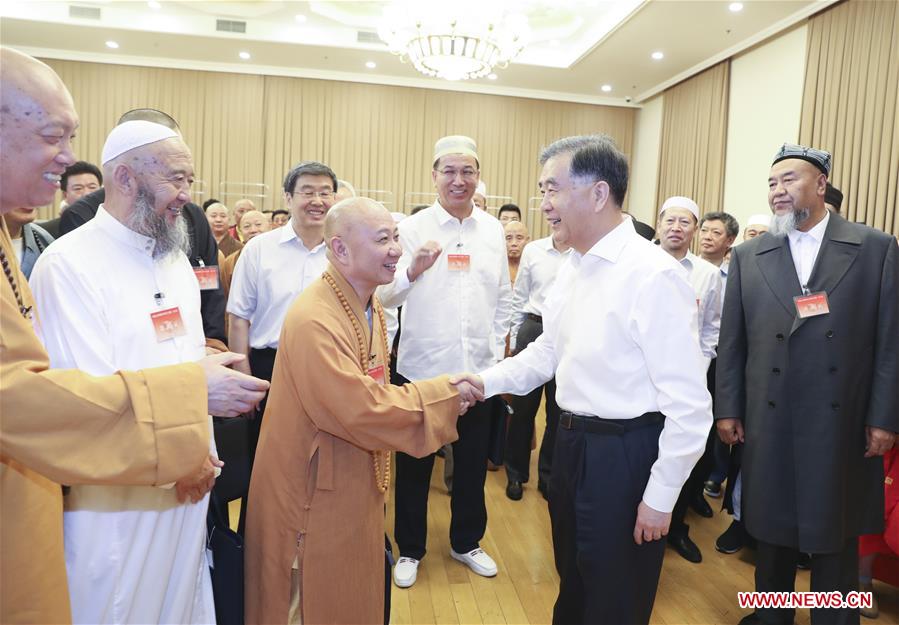 Wang Yang, a member of the Standing Committee of the Political Bureau of the Communist Party of China (CPC) Central Committee and chairman of the Chinese People's Political Consultative Conference (CPPCC) National Committee, meets with delegates attending a session of the China Committee on Religion and Peace (CCRP) in Beijing, capital of China, July 3, 2019. Wang also made a speech at the CCRP session on Wednesday. [Photo/Xinhua]