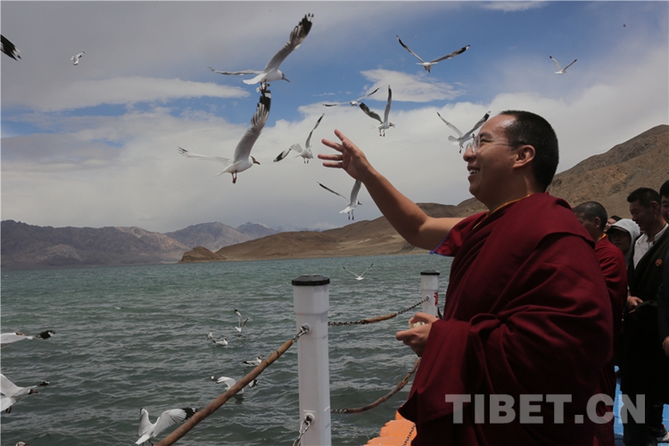Photo shows the 11th Panchen Lama Choskyi Gyalpo visit the Pangong Tso Lake in Ngari, southwest China's Tibet Autonomous Region on July 26, 2019.