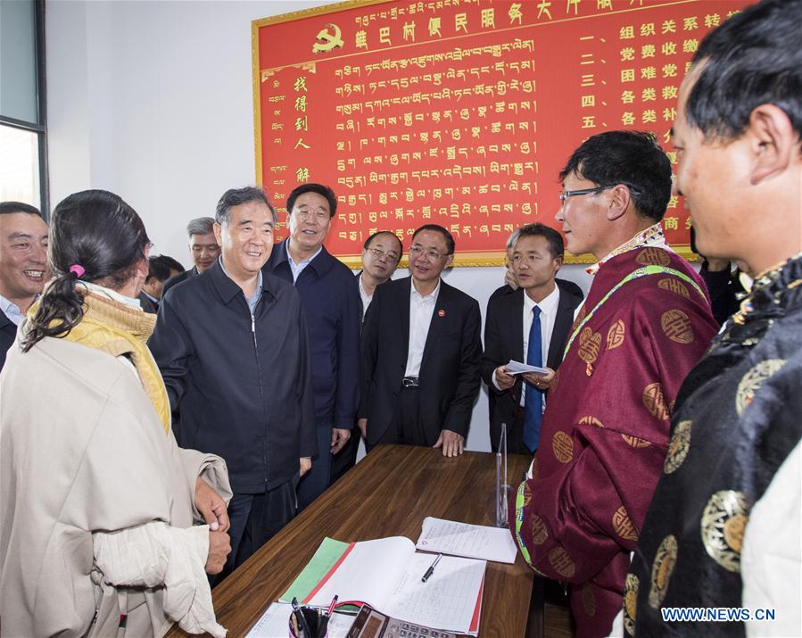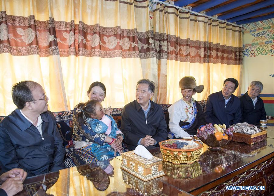 Wang Yang, a member of the Standing Committee of the Political Bureau of the Communist Party of China Central Committee and chairman of the National Committee of the Chinese People's Political Consultative Conference, inquires rural residents about their livelihoods after being lifted out of poverty at a village in Burang County of Ngari Prefecture, southwest China's Tibet Autonomous Region, Aug. 20, 2019. Wang made a research trip from Monday to Wednesday in Tibet. [Photo/Xinhua]