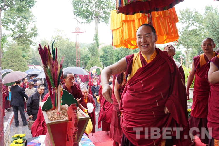 The 11th Panchen Lama throws highland barley in the air, praying for a good harvest.
