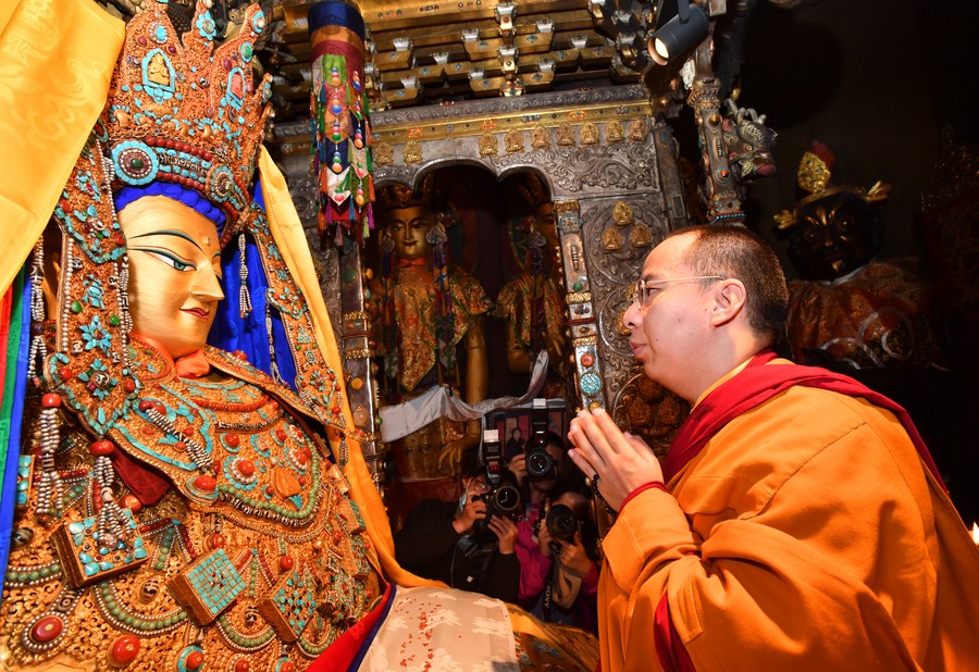 The 11th Panchen Lama, Bainqen Erdini Qoigyijabu, also a member of the Standing Committee of the National Committee of the Chinese People's Political Consultative Conference, vice president of the Buddhist Association of China and president of the association's Tibet branch, visits Jokhang Temple, the most revered monastery in Lhasa, southwest China's Tibet Autonomous Region, Aug. 3, 2020. (Xinhua/Chogo)