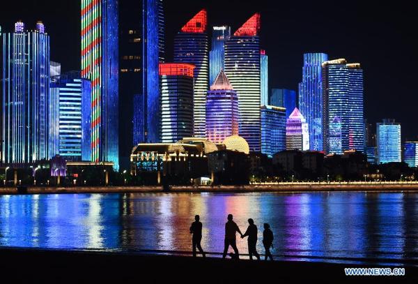 Photo taken on May 3, 2018 shows the night view of Fushan Bay in Qingdao, east China's Shandong Province. The 18th Shanghai Cooperation Organization (SCO) Summit is scheduled for June 9 to 10 in Qingdao. (Xinhua/Li Ziheng)