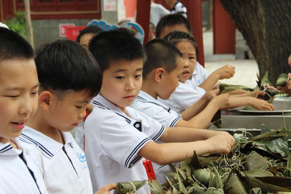 Primary school students learn to wrap up Zongzi at a cultural event held in Beijing Folklore Museum to celebrate the Dragon Boat Festival. Zongzi is a glutinous rice pudding with various fillings wrapped in bamboo or reed leaves, and is often eat during the Dragon Boat Festival. [Photo: China Plus/Zhu Yan]