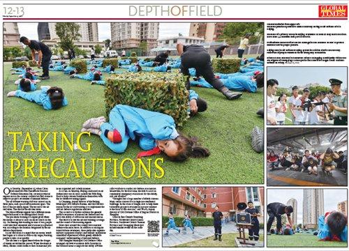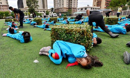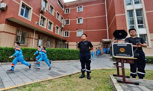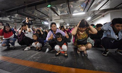 Beijing tests its air defense warning system in Haidian district on Saturday. Hundreds of people rehearsed for an emergency evacuation. Photo:VCG