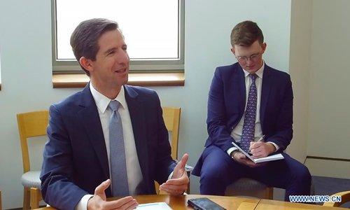 Australian Minister for Trade, Tourism and Investment Simon Birmingham (L) receives an interview in Canberra, Australia, Oct. 17, 2018. The China International Import Expo (CIIE), to be held on Nov. 5-10, is a great opportunity for businesses from around the world, Australian Minister for Trade, Tourism and Investment Simon Birmingham. (Xinhua/Pan Xiangyue)