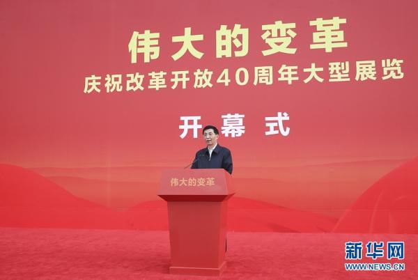 Wang Huning announces the opening of the exhibition of commemorating the 40th anniversary of China's reform and opening-up at the National Museum of China on November 13, 2018. [Photo: Xinhua]