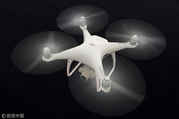 In this picture taken on May 11, 2017, a drone flies in the showroom of the China drone-maker DJI headquarters in Shenzhen. [Photo: VCG]