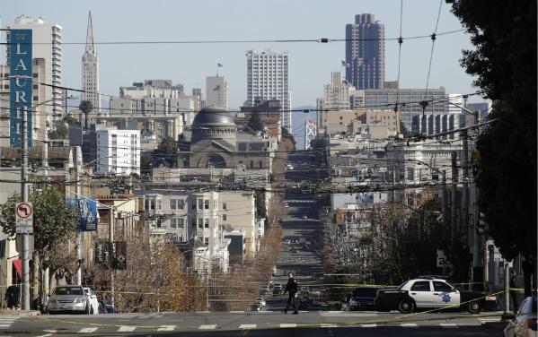A police officer walks in an intersection closed off by police tape on California Street in San Francisco, Thursday, Dec. 13, 2018. Authorities say bomb threats sent to dozens of schools, universities and other locations across the U.S. appear to be a hoax. [Photo: AP]