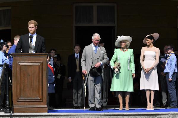 Britain's Prince Harry speaks, as Prince Charles, Camilla, the Duchess of Cornwall and Meghan, the Duchess of Sussex listen, during a garden party at Buckingham Palace in London, Tuesday May 22, 2018. The event is part of the celebrations to mark the 70th birthday of Prince Charles. [Photo: AP/Dominic Lipinski]
