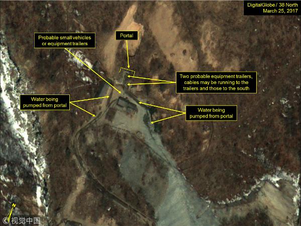 Probable cabling and water drainage seen at the North Portal of the Punggye-ri nuclear test site in DPRK, March 25, 2017. [File photo: VCG]