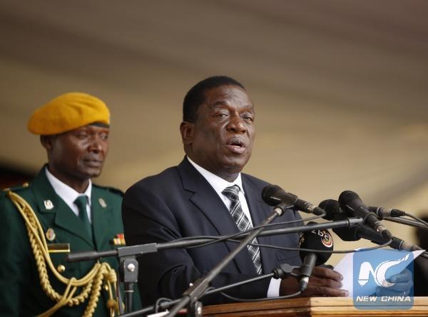 Zimbabwean President Emmerson Mnangagwa (Front) speaks during a ceremony to rename the country's army and air force headquarters, in Harare, capital of Zimbabwe, Dec. 6, 2017. [File Photo: Xinhua/Shaun Jusa]