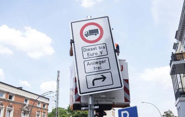 In this May 15, 2018 file photo a sign banning trucks and cars with old diesel engines from a street is installed in Hamburg, northern Germany. [Photo: AP]