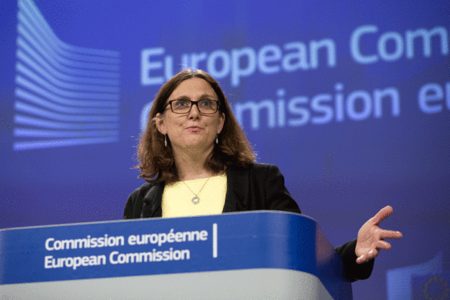 European Commissioner for Trade Cecilia Malmstrom speaks during a media conference, following the United States announcement to impose tariffs on steel and aluminum, at EU headquarters in Brussels, Friday, June 1, 2018. [File Photo: AP/Virginia Mayo]