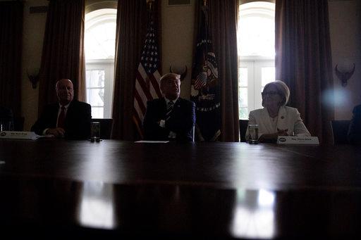 The lights go out as President Donald Trump, center, accompanied by House Ways and Means Committee chairman Rep. Kevin Brady, R-Texas, left, and Rep. Diane Black, R-Tn., right, speaks in the Cabinet room of the White House, Tuesday, July 17, 2018, in Washington. Trump says he meant the opposite when he said in Helsinki that he doesn't see why Russia would have interfered in the 2016 U.S. elections. [Photo: AP/Andrew Harnik]