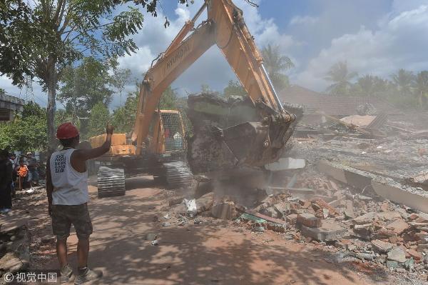 An Indonesian search and rescue team uses heavy equipment to search for earthquake victims in Tanjung on Lombok island on August 9, 2018. [photo: VCG]