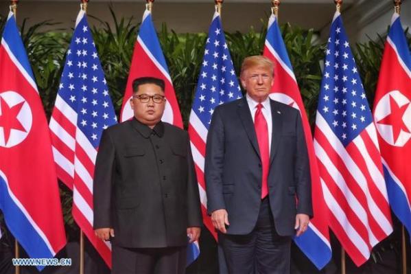 Top leader of the Democratic People's Republic of Korea (DPRK) Kim Jong Un (L) meets with U.S. President Donald Trump in Singapore, on June 12, 2018. [File photo: Xinhua]