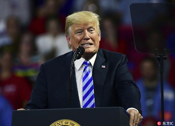 President Donald Trump speaks during a rally Tuesday, Aug. 21, 2018, at the Civic Center in Charleston W.Va. [File photo: IC]