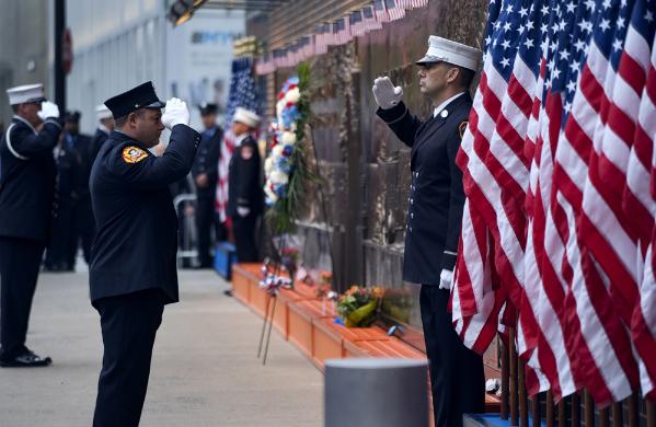 New York City firefighters salute in front of a memorial on the side of a firehouse adjacent to One World Trade Center and the 9/11 Memorial site during ceremonies on the anniversary of 9/11 terrorist attacks in New York on Tuesday, Sept. 11, 2018. [Photo: AP/Craig Ruttle]