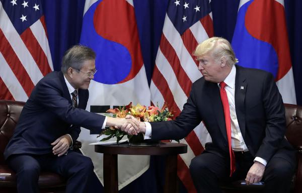 U.S. President Donald Trump shakes hands with South Korean President Moon Jae-In at the Lotte New York Palace hotel during the United Nations General Assembly, Monday, Sept. 24, 2018, in New York. [Photo: AP/Evan Vucci]