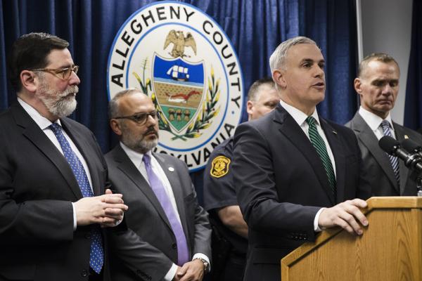 United States Attorney Scott Brady, at podium, speaks with members of the media during a news conference in the aftermath of a deadly shooting at the Tree of Life Synagogue in Pittsburgh, Sunday, Oct. 28, 2018. [Photo: AP]