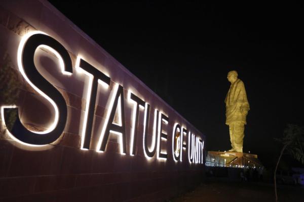The Statue of Unity is seen at dusk at Kevadiya Colony in Narmada district of Gujarat State, India, Wednesday, Oct. 31, 2018. Indian Prime Minister Narendra Modi on Wednesday unveiled the towering bronze statue of Sardar Vallabhbhai Patel, a key independence leader being promoted as a national icon in the ruling party's campaign ahead of next year's general elections. [Photo:AP]