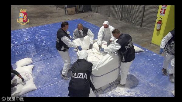 Police officers check bags found in Genoa harbour in this video grab provided by the Italian Police, November 8, 2018. [Photo: VCG]