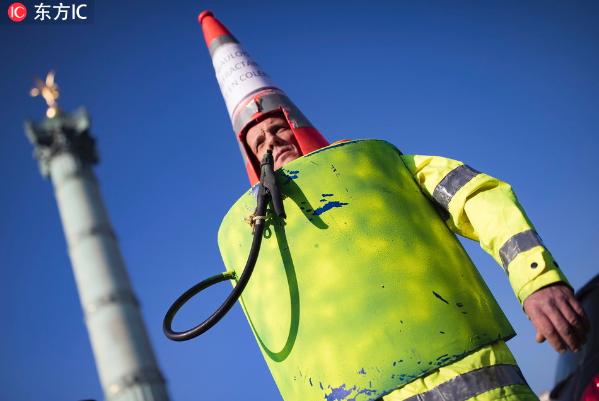 A man wearing a costume symbolizing a petrol pump, painted high-visibility yellow, like the mandatory high-visibility yellow vests in cars which has become a symbol of French driver's and citizen's protest against higher fuel prices, on Place de la Bastille as protesters try to block roads and cause traffic disruptions as part of a nationwide protest, in Paris, France, November 17, 2018.[Photo: IC]