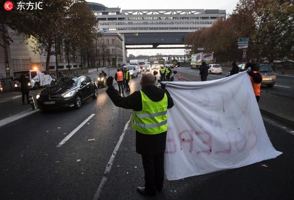 A man wearing a yellow high-visibility vest (mandatory in all vehicles in France) which has become a symbol of French driver's and citizen's protest against higher fuel prices, stands on a Uber car parked on Place de la Bastille as they try to block roads and cause traffic chaos as part of a nationwide protest, in Paris, France, November 17, 2018.[Photo: IC]
