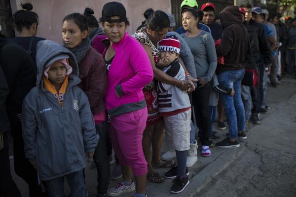 Central American migrants wait in line for a donated breakfast at a temporary shelter in Tijuana, Mexico, early Saturday morning, Nov. 17, 2018. [Photo: AP/Rodrigo Abd]