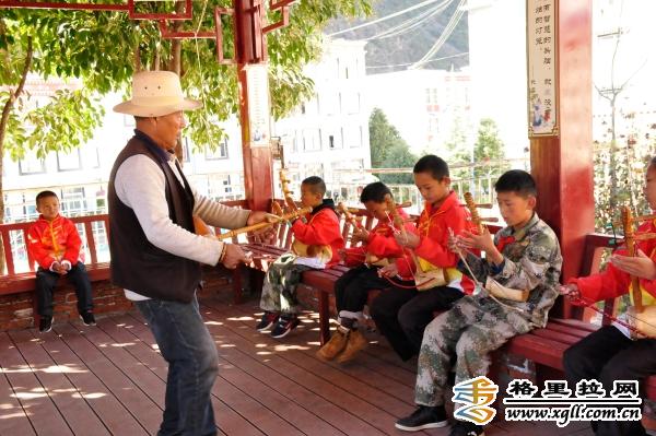 Wangdu teaches students from the Wujing Township Primary School to play Shinze.