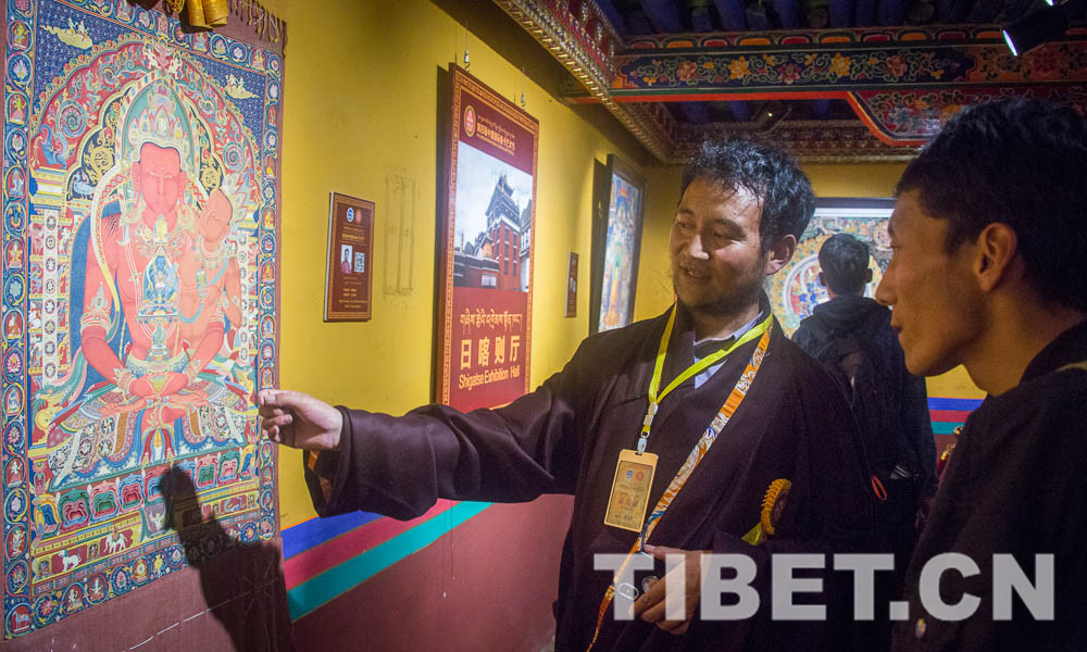 Photo shows that Zhaba Tenzin is introducing his thangka art works to visitors.