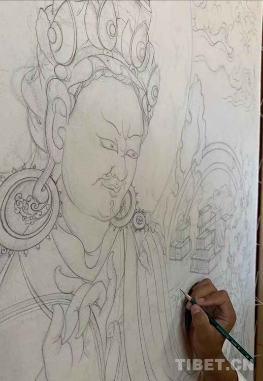 A thangka master at the Xiangzang Art School fills in the outline of a thangka sketch in pencil.